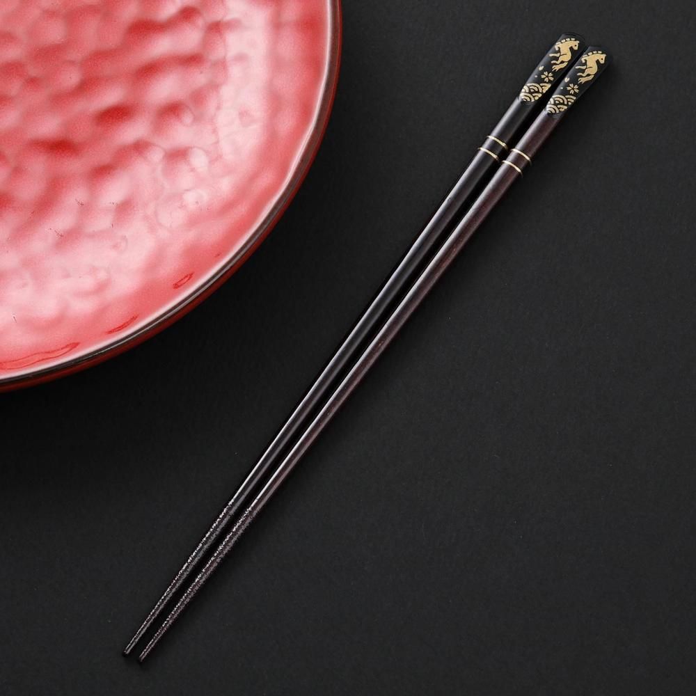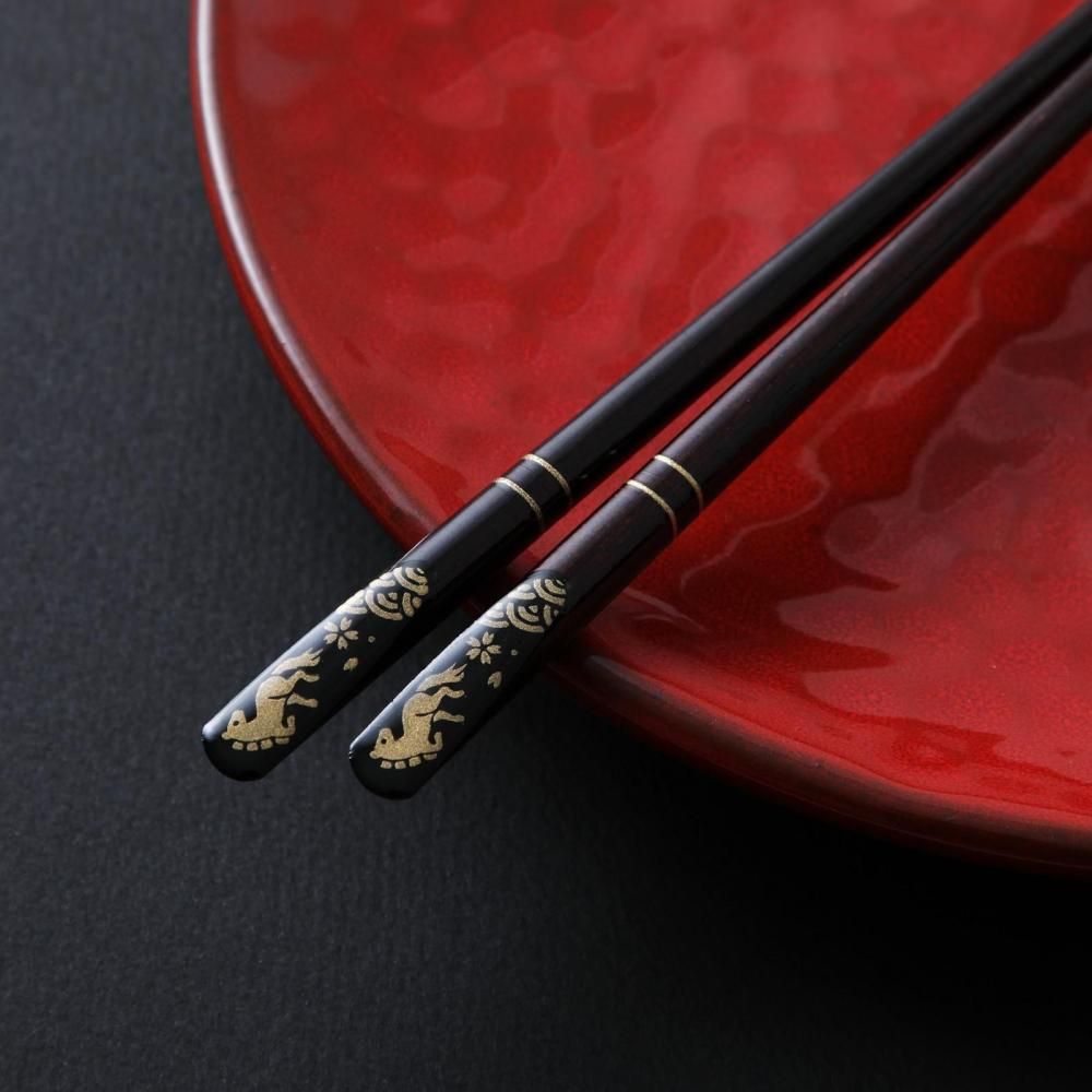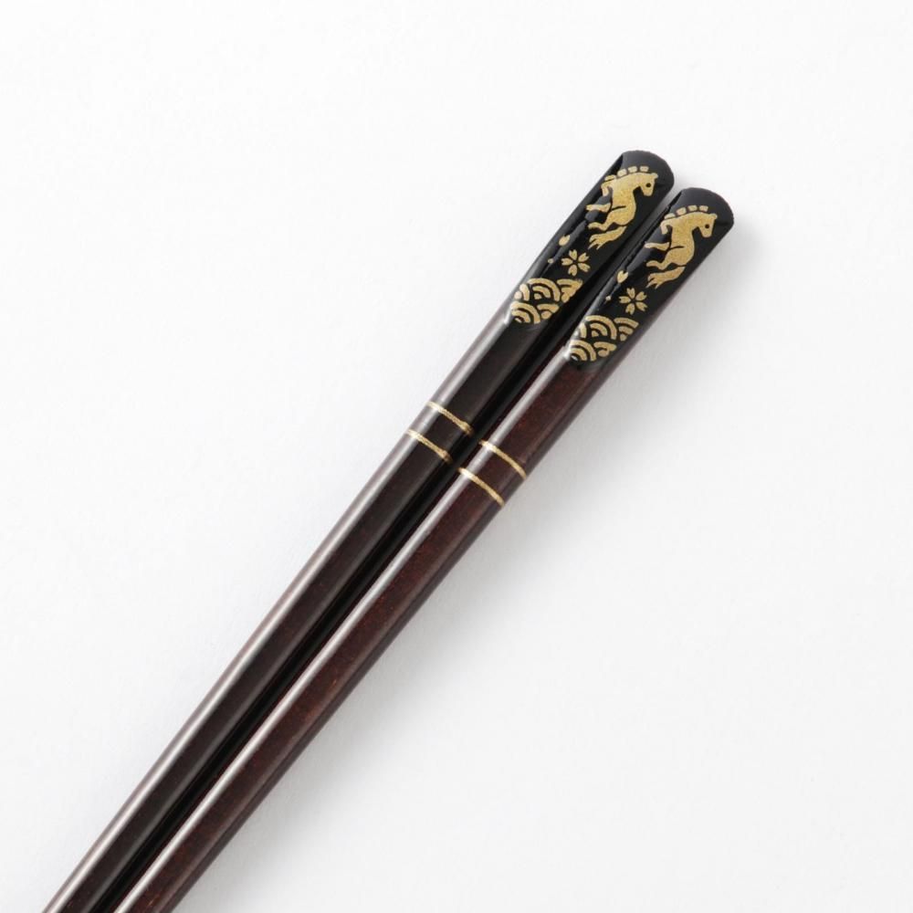 2026年は午年。かわいらしい馬と桜のイラストはファンシーすぎず上品な印象。転がりづらく持ちやすい四角箸でどなた様も使いやすいのも魅力です。