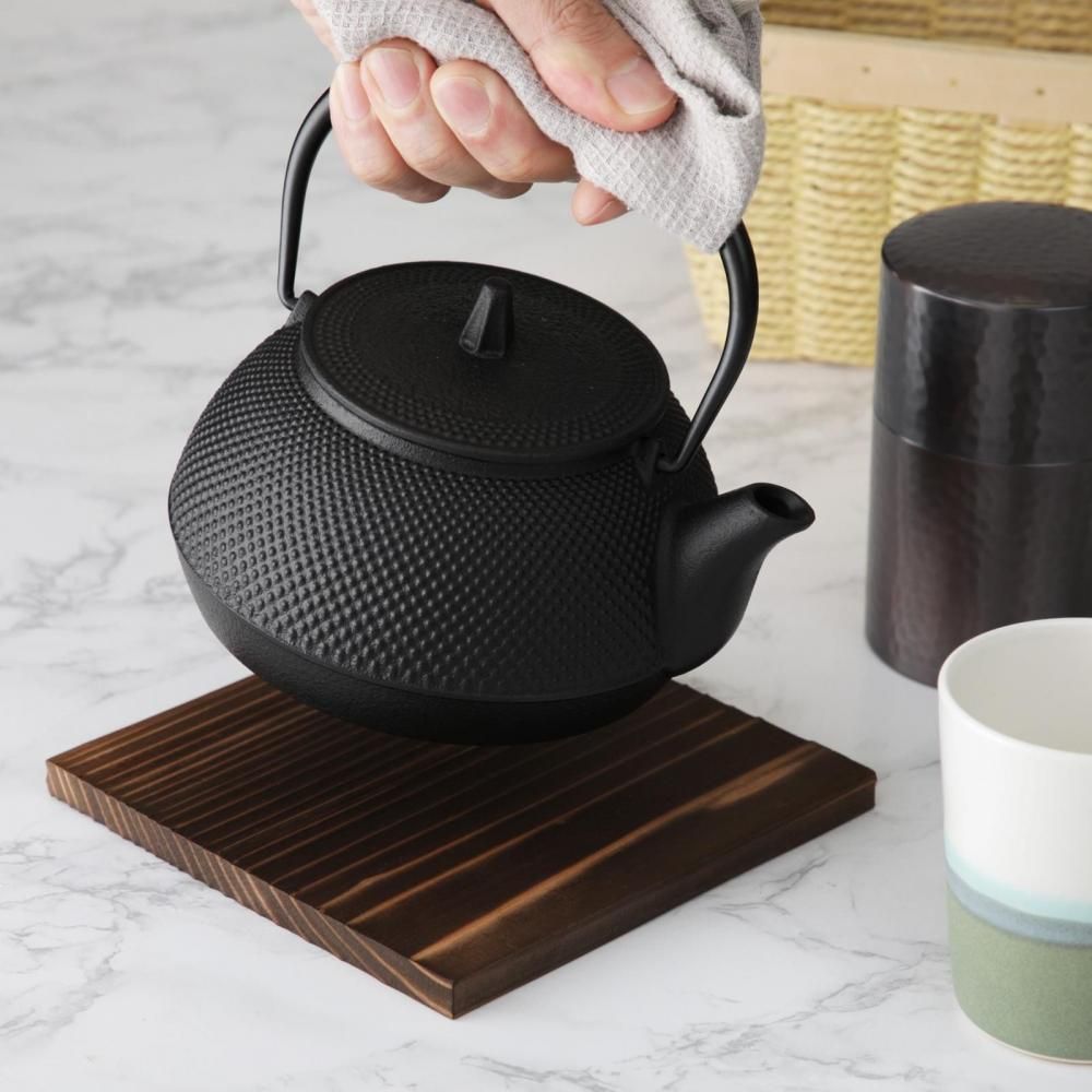 南部鉄器の鉄瓶(鉄急須)です。飽きの来ないデザインと適度なサイズ。初めて鉄瓶を購入される方にもおすすめの鉄瓶です。内側には琺瑯加工がなく、自然に鉄分を摂取できます。ガスコンロ、IHのどちらにも対応しています。また、焼き杉板で作った瓶敷もセットにお付けしておりますので、食卓のテーブルを傷めずに気軽にご使用いただけます。瓶敷にはレーザー彫刻でお名前をお入れする無料サービスもございますので、大切な方への贈り物にも最適です。ラッピングや熨斗(のし)も無料で対応いたします。